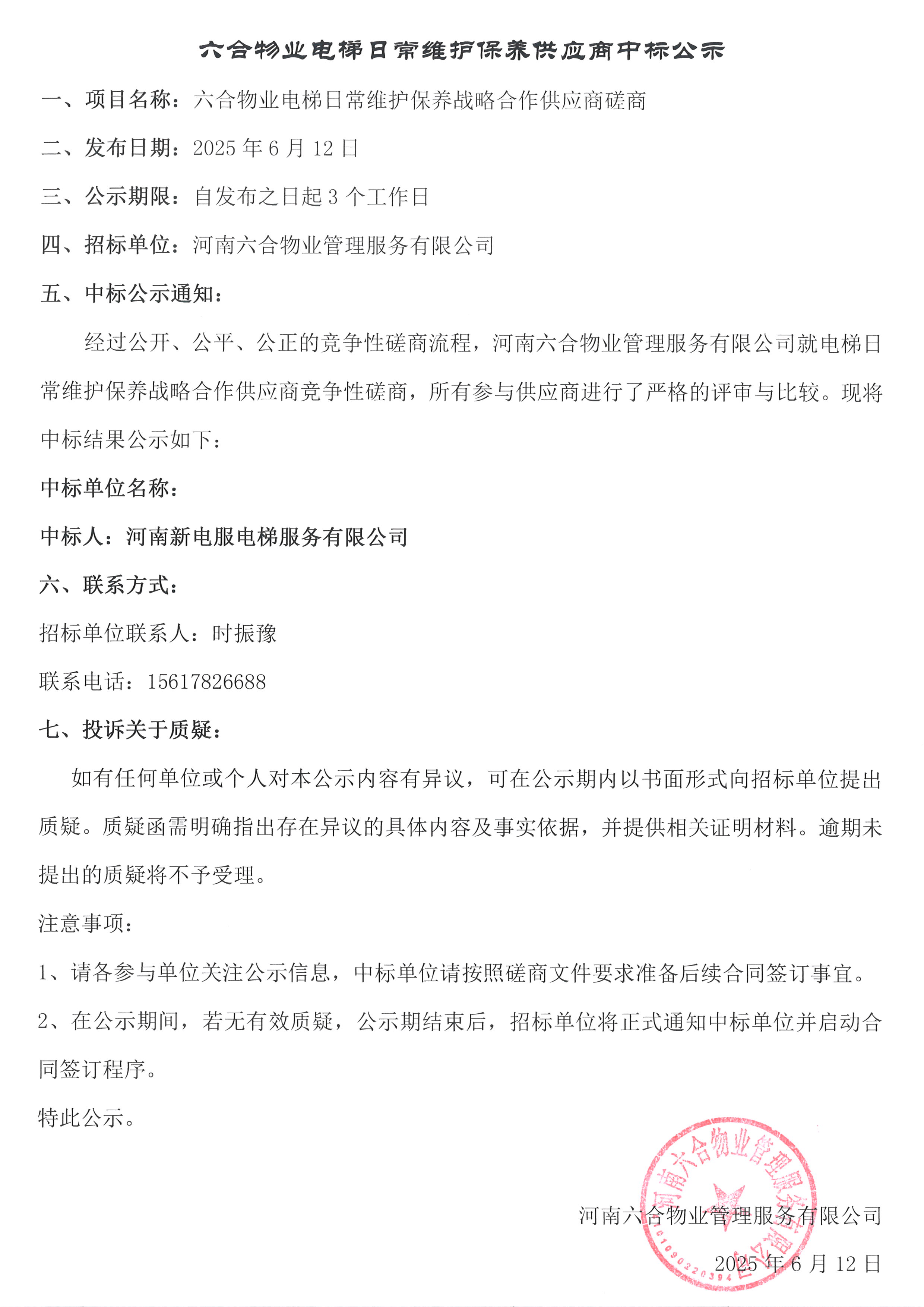 六合物業電梯日常維護保養供應商中標公示 發布時間:06-12瀏覽次數:0 查看詳情>>