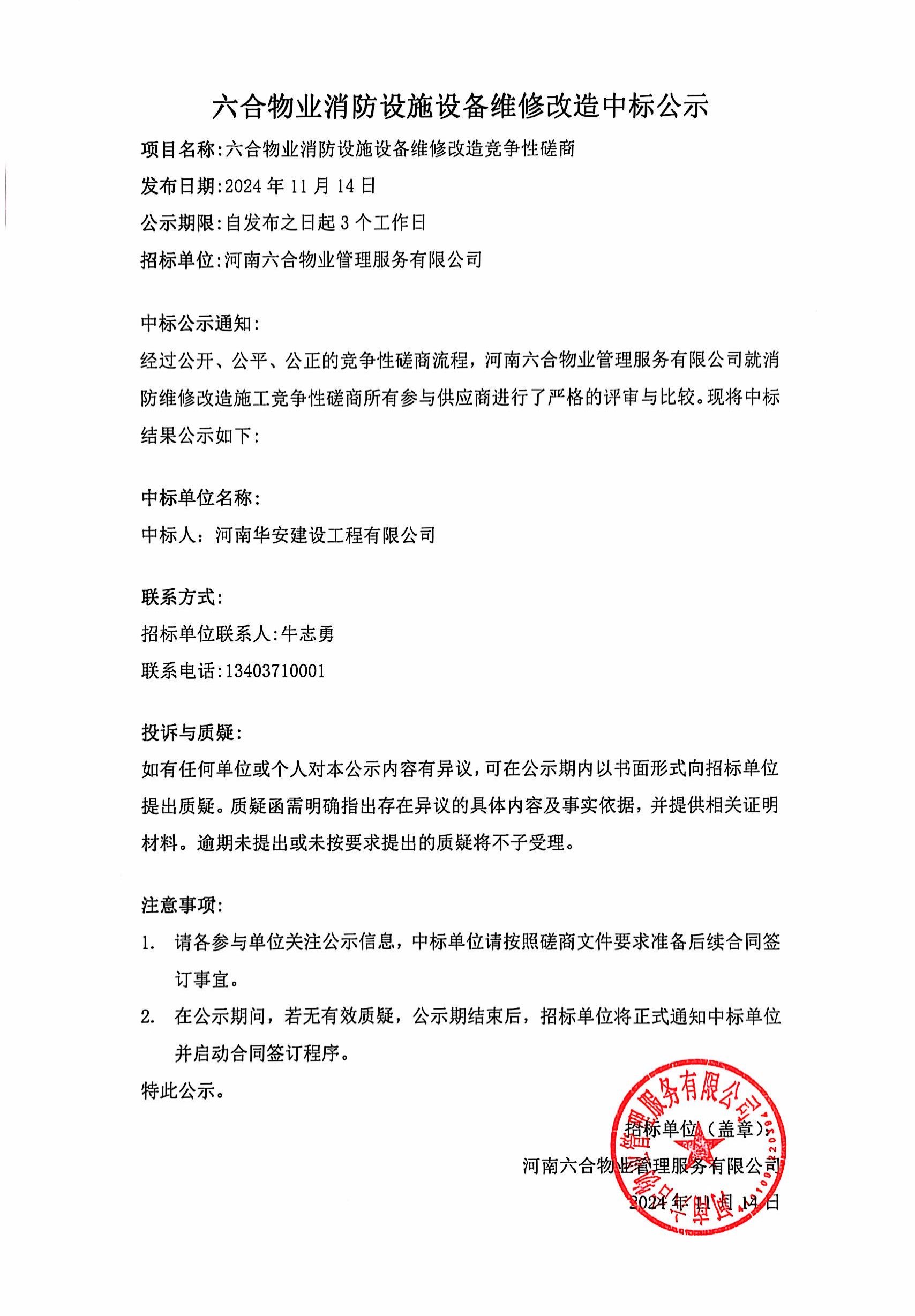 六合物業消防設施設備維修改造中標公示 發布時間:11-14瀏覽次數:0 查看詳情>>