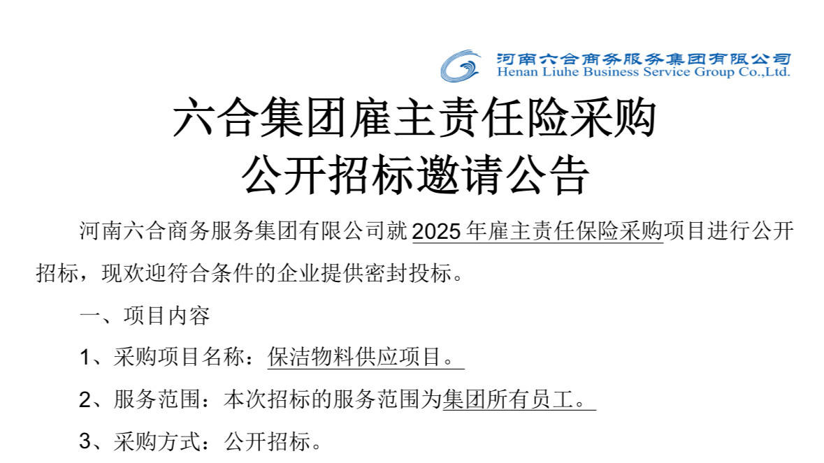 六合集團雇主責任險采購公開招標邀請公告 六合集團雇主責任險采購公開招標邀請公告 河南六合商務服務集團有限公司就2025年雇主責任保險采購項目進行公開招標,現歡迎符合條件的企業提供密封投標。一、項目內容1、采 發布時間:05-08瀏覽次數:3 查看詳情>>