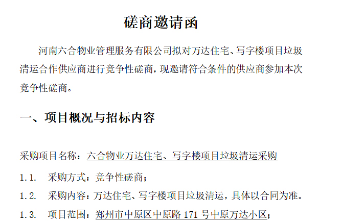 六合物業萬達住宅、寫字樓項目垃圾清運采購磋商邀請函 磋商邀請函河南六合物業管理服務有限公司擬對萬達住宅、寫字樓項目垃圾清運合作供應商進行競爭性磋商,現邀請符合條件的供應商參加本次競爭性磋商。一、項目概況與招標內容 發布時間:05-14瀏覽次數:1 查看詳情>>